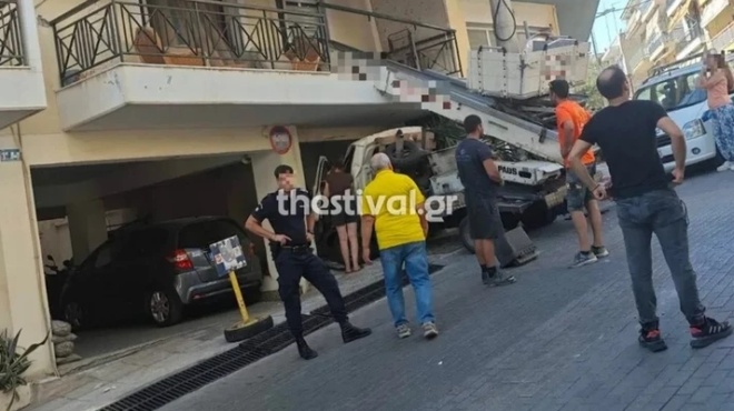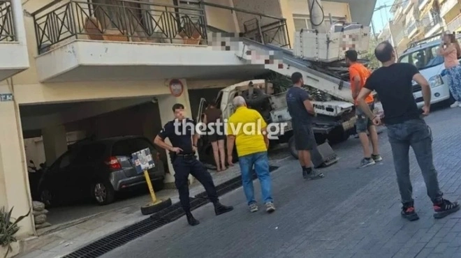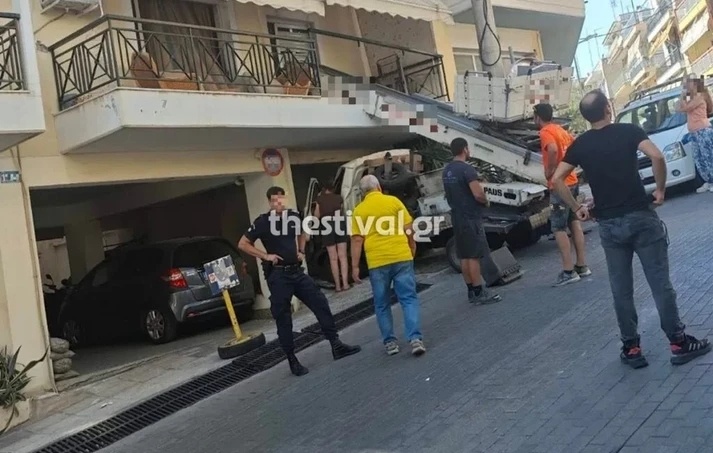 Το απόγευμα της περασμένης Δευτέρας στην περιοχή των Συκεών στη Θεσσαλονίκη ένα γερανοφόρο όχημα εισήλθε σε πιλοτή πολυκατοικίας και τον γερανό να πέφτει στο μπαλκόνι του πρώτου ορόφου.