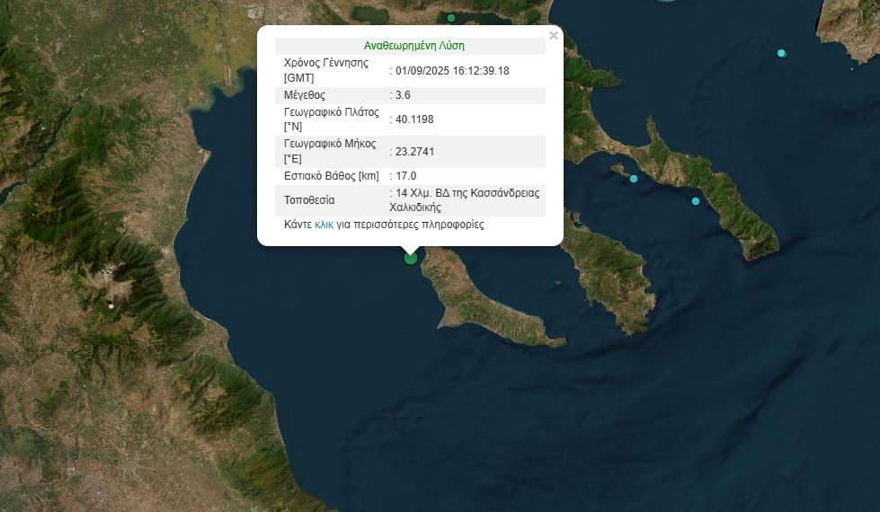 Σύμφωνα με το Γεωδυναμικό Ινστιτούτο το επίκεντρο εντοπίζεται 14χλ. βορειοδυτικά της Κασσάνδρας.