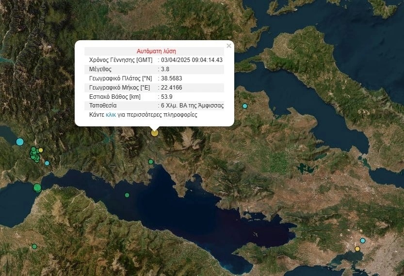 Συγκεκριμένα το επίκεντρο εντοπίζεται 6 χιλιόμετρα βορειοανατολικά της Άμφισσας ενώ το εστιακό βάθος, σύμφωνα με το Γεωδυναμικό Ινστιτούτο, ήταν στα 53,9 χιλιόμετρα.