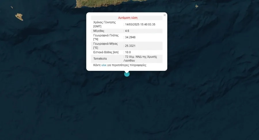 Ο σεισμός είχε μέγεθος 4,6 της κλίμακας Ρίχτερ με εστιακό βάθος 10 χιλιομέτρων, ενώ το επίκεντρό του καταγράφηκε στα 72 χιλιόμετρα Νότια – νοτιοδυτικά της Χρυσής Λασιθίου.