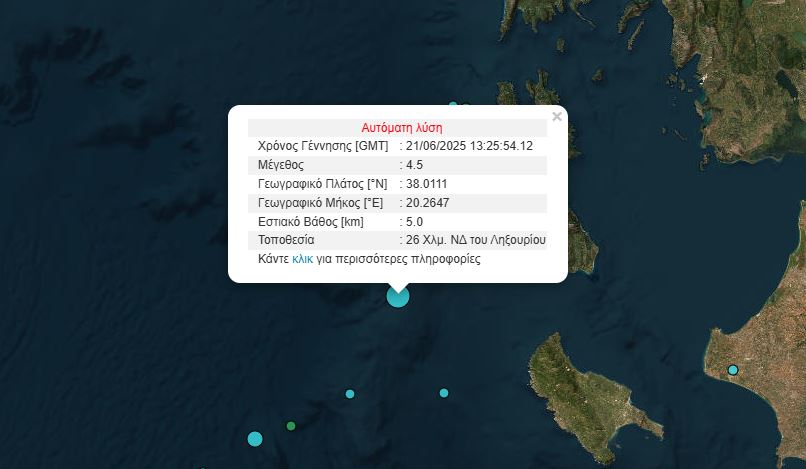 Σεισμός 4,5 βαθμών της κλίμακας Ρίχτερ σημειώθηκε πριν από λίγο ανοιχτά της Κεφαλονιάς.