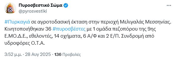 Φωτιά εκδηλώθηκε σε αγροτοδασική έκταση στην περιοχή του Μελιγαλά Μεσσηνίας, κοντά σε σπίτια νωρίς το απόγευμα της Πέμπτης (28/08).