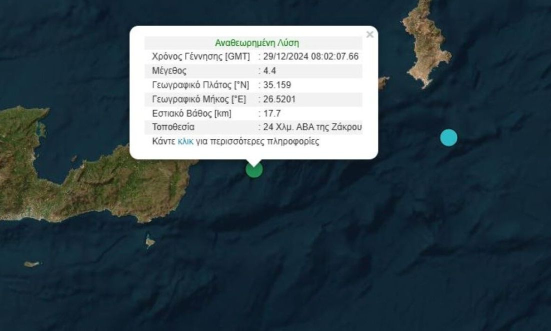 Σύμφωνα με το Γεωδυναμικό Ινστιτούτο, η δόνηση μεγέθους 4,4 βαθμών της κλίμακας Ρίχτερ σημειώθηκε 24 χλμ. ανατολικά-βορειοανατολικά της Ζάκρου.