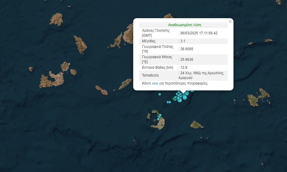 Το επίκεντρο του σεισμού εντοπίστηκε 24 xλμ ΝΝΔ της Αρκεσίνης Αμοργού, στη θαλάσσια περιοχή κοντά στη Σαντορίνη.