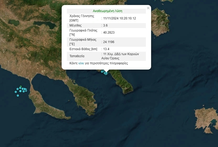 Σύμφωνα με την αναθεωρημένη λύση του Γεωδυναμικού Ινστιτούτου του Αστεροσκοπείου Αθηνών ο σεισμός είχε ένταση 3.6 βαθμούς της κλίμακας Ρίχτερ και σημειώθηκε στις 12:20 το μεσημέρι της Δευτέρας (11/11).