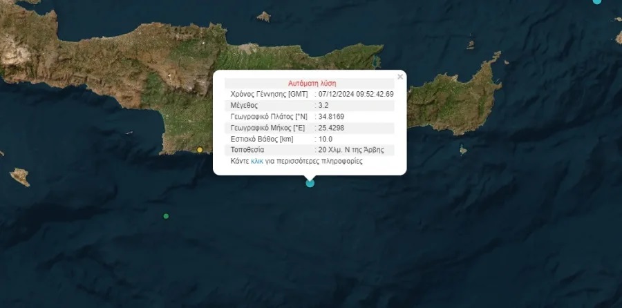 Σεισμική δόνηση μεγέθους 3,2 της κλίμακας Ρίχτερ σημειώθηκε πριν από λίγο ανοιχτά της Κρήτης.