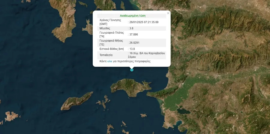 Σύμφωνα με το Γεωδυναμικό Ινστιτούτο, το επίκεντρο του σεισμού ήταν σε θαλάσσια περιοχή 16 χιλιόμετρα βορειοανατολικά του Καρλοβασίου.