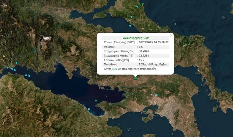 Σεισμός μεγέθους 3,6 της κλίμακας Ρίχτερ συνέβη το μεσημέρι της Δευτέρας 10 Μαρτίου στη Θήβα.