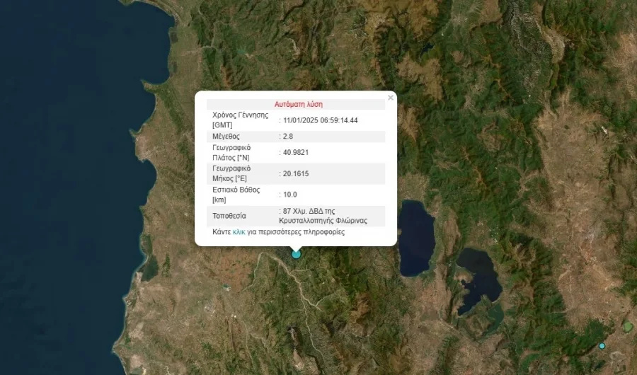 Συγκεκριμένα, πρόκειται για σεισμό 2,8 βαθμών Ρίχτερ, με εστιακό βάθος 10, 87 χλμ ΔΒΔ της Κρυσταλλοπηγής Φλώρινας. Η περιοχή «ταρακουνήθηκε» στις 8:59 το πρωί.
