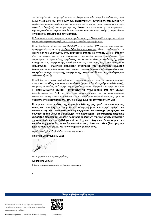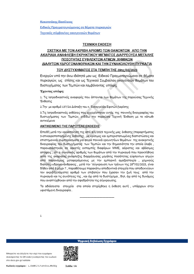 «Επειδή μετά την κοινοποίηση της από 9/1/2025 τεχνικής μας έκθεσης (παραρτήματος 3-επικαιροποποιημένης έκθεσης), με κρίσιμες και εμπεριστατωμένες διαπιστώσεις και επιστημονικά συμπεράσματα για σειρά ποινικά ερευνητέων θεμάτων της ανακριτικής δικογραφίας του δυστυχήματος των Τεμπών και την δημοσιότητα την οποία έλαβε, παρουσιάστηκαν σε αρκετές εκπομπές διαφόρων ΜΜΕ, αόριστες και αβάσιμες απόψεις , ότι ο συνολικός αριθμός των θυμάτων από την πυρκαγιά που προκλήθηκε αιτία της ακαριαίας ανάφλεξης διαρρέουσας μεγάλης ποσότητας εύφλεκτων ατμών από παρανόμως μεταφερόμενους με την εμπορική αμαξοστοιχία, χημικούς διαλύτες-υδρογονάνθρακες , μετά την σύγκρουση των τρένων της 28ης/02/2023, είναι δήθεν από 5 μέχρι 7 , παραθέτουμε παρακάτω αποδεικτικά στοιχεία που αποδεικνύουν τον ακριβή(ελάχιστο) αριθμό των επιβατών που έχασαν την ζωή τους από την πυρκαγιά και τις συνέπειες της , και όχι από το δυστύχημα , δηλ. όχι από τις δυνάμεις που αναπτύχθηκαν από την σφοδρότητα της σύγκρουσης», αναφέρει η έκθεση.