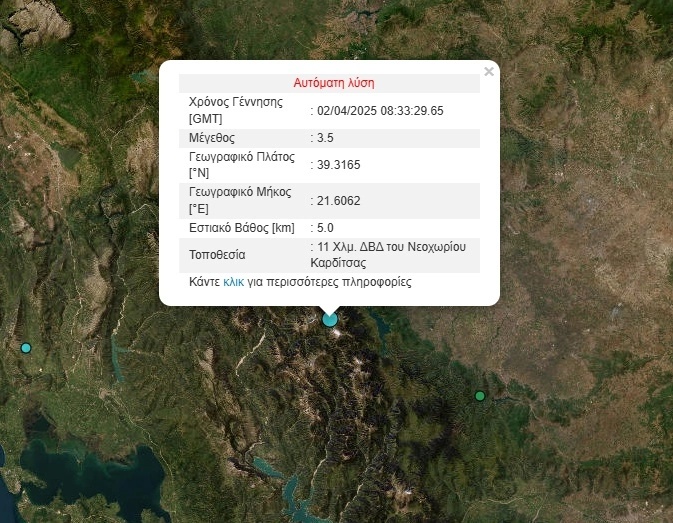 Σεισμός 3,5 βαθμών της κλίμακας Ρίχτερ σημειώθηκε το πρωί της Τετάρτης 2 Απριλίου, στην ευρύτερη περιοχή της Καρδίτσας.