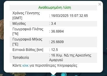 Ειδικότερα, ο σεισμός σημειώθηκε στις 17:07 και είχε μέγεθος 3,4 Ρίχτερ και έγινε αισθητός σε Σαντορίνη και Αμοργό. Το επίκεντρο της δόνησης ήταν 20χλμ. ΝΔ της Αρκεσίνης Αμοργού και είναι ο ίδιος εστιακός χώρος που έχουμε το τελευταίο διάστημα τους εκατοντάδες σεισμούς.