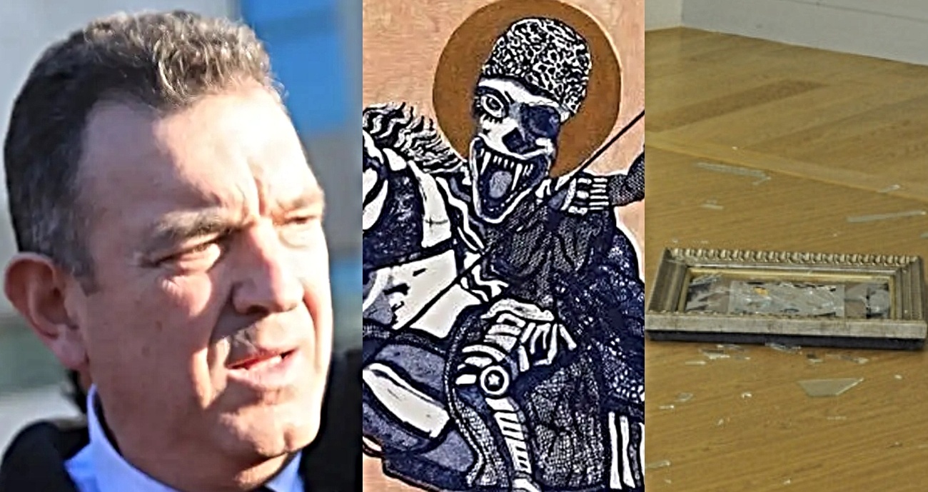 «Σήμερα Δευτέρα 10 Μαρτίου 2025 και ώρα 11.35 η Εθνική Πινακοθήκη-Μουσείο Αλεξάνδρου Σούτσου δέχθηκε επίθεση από τον βουλευτή του κόμματος «ΝΙΚΗ», κ. Νίκο Παπαδόπουλο, ο οποίος με τη συνδρομή ετέρου ατόμου επιτέθηκε σε τέσσερα έργα τέχνης του Χριστόφορου Κατσαδιώτη, με τίτλους: «Εικόνισμα 1ο», «Εικόνισμα 16ο», «Εικόνισμα 17ο», «Ο Άγιος Χριστόφορος». Τα έργα εκτίθενται στο Μεσοπάτωμα, στο πλαίσιο του προγράμματος «Ενδιάμεσος Χώρος», στην έκθεση με τίτλο Η Σαγήνη του Αλλόκοτου. Οι ανωτέρω τα απέσπασαν βίαια από τον τοίχο και τα πέταξαν στο δάπεδο με συνέπεια τη θραύση τους.