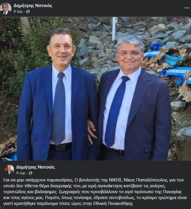 «Για να μην υπάρχουν παρανοήσεις. Ο βουλευτής της ΝΙΚΗΣ, Νίκος Παπαδόπουλος, για τον οποίο δεν τίθεται θέμα διαγραφής του, με ιερή αγανάκτηση κατέβασε τις ανίερες, τερατώδεις και βλάσφημες ζωγραφιές που προσβάλλουν το ιερό πρόσωπο της Παναγίας και τους αγίους μας. Παρότι, όπως τονίσαμε, έδρασε αυτοβούλως, το κρίσιμο ερώτημα είναι γιατί κρατήθηκε παράνομα τόσες ώρες στην Εθνική Πινακοθήκη;» αναφέρει στην ανάρτησή του.