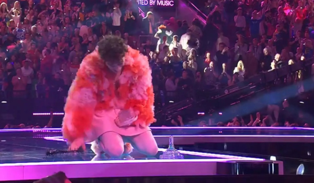 Αφού παρέλαβε το βραβείο από την περσινή νικήτρια, Loreen, και ερμήνευσε γεμάτος συγκίνηση το τραγούδι του, ξεκίνησε να πανηγυρίζει, γονάτισε και μία απότομη κίνηση είχε ως αποτέλεσμα να… σπάσει το βραβείο του.