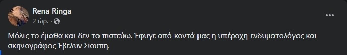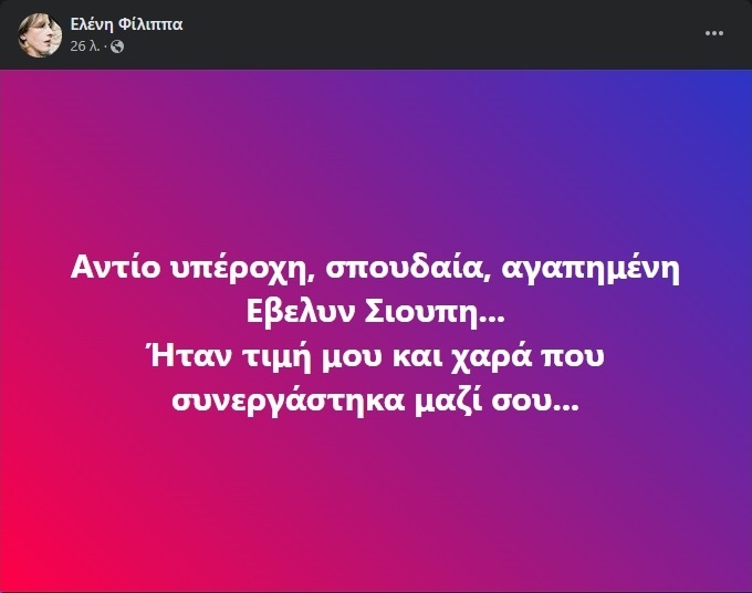 Μεταξύ αυτών και ο Χάρης Ρώμας, ο οποίος έκανε μια συγκινητική ανάρτηση στον προσωπικό του λογαριασμό στο Facebook τη Δευτέρα 5/8 για την Έβελυν Σιούπη, θέλοντας να την αποχαιρετήσει για τελευταία φορά.