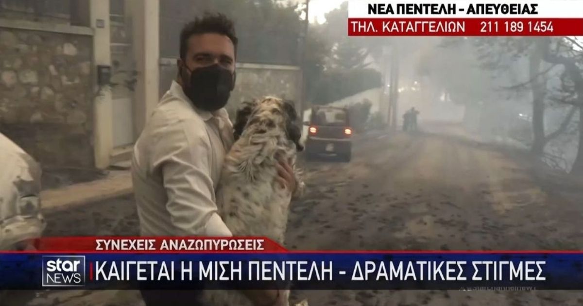 Ο ρεπόρτερ του Star, Άρης Λάμπος, διέκοψε τη ζωντανή μετάδοση από το μέτωπο της φωτιάς στην Αττική για να σώσει ένα μικρό σκυλάκι που βρέθηκε μόνο του, πανικόβλητο μέσα στις φλόγες. Το σκυλί, που είχε καψαλισμένο τρίχωμα, ήταν εμφανώς τρομαγμένο, και ο Λάμπος το πήρε στα χέρια του για να το προστατεύσει και να βρει τον ιδιοκτήτη του, καθώς φορούσε ταμπελάκι.