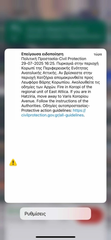 Για τη φωτιά λίγο πριν τις 16:30 ήχησε το 112 και καλεί όσους βρίσκονται στην περιοχή Χατζήρια να απομακρυνθούν προς τη Λεωφόρο Βάρης Κορωπίου.