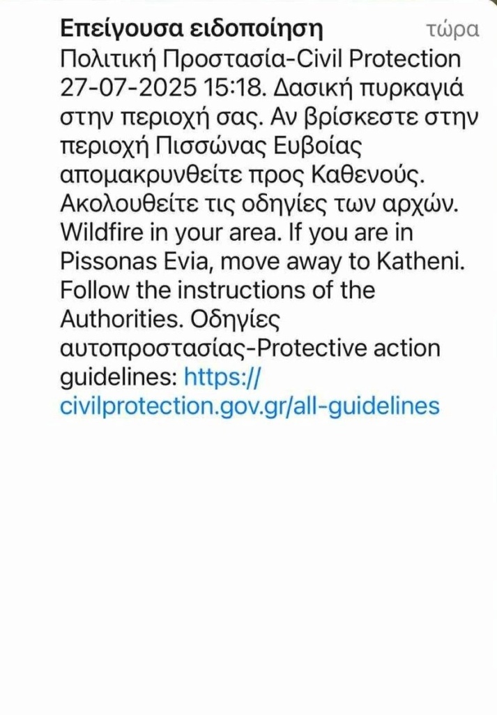 Μήνυμα του 112 για εκκένωση του χωριού Πισσώνα έφτασε ήδη στα κινητά τηλέφωνα των κατοίκων και όσων κινούνται στην περιοχή.