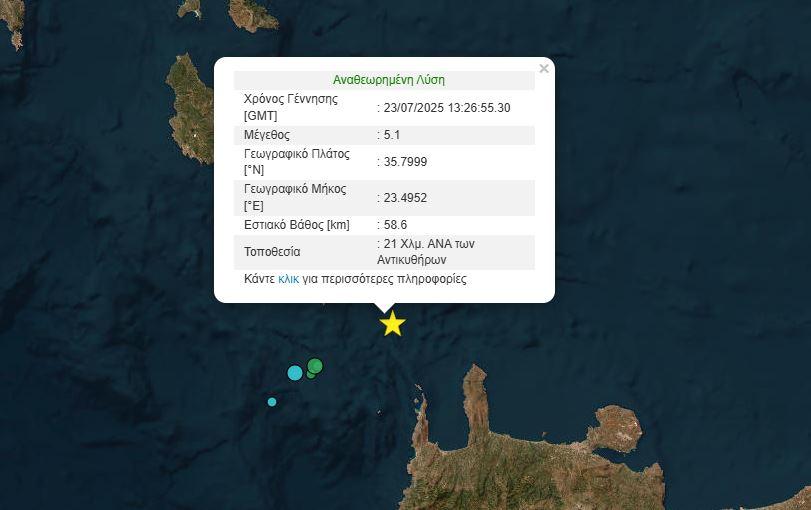 Ισχυρός σεισμός 5,1 βαθμών της κλίμακας Ρίχτερ σημειώθηκε πριν απο λίγο ανάμεσα σε Κρήτη και Αντικύθηρα.