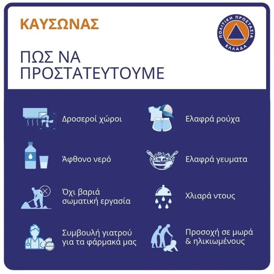 Ειδικότερα, σύμφωνα με τις οδηγίες αυτοπροστασίας από τις υψηλές θερμοκρασίες, συνιστάται στους πολίτες: