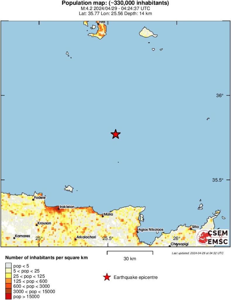 Το επίκεντρο τη δόνησης εντοπίζεται στα 60 χλμ. βόρεια – βορειοανατολικά του Ηρακλείου Κρήτης σύμφωνα με το EMSC, ενώ το εστιακό βάθος υπολογίζεται στα 14 χλμ.