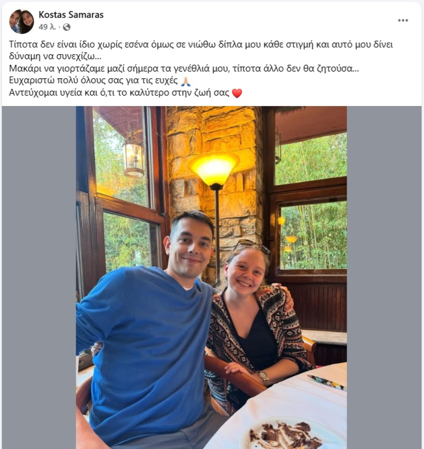 «Τίποτα δεν είναι ίδιο χωρίς εσένα όμως σε νιώθω δίπλα μου κάθε στιγμή και αυτό μου δίνει δύναμη να συνεχίζω… Μακάρι να γιορτάζαμε μαζί σήμερα τα γενέθλιά μου, τίποτα άλλο δεν θα ζητούσα… Ευχαριστώ πολύ όλους σας για τις ευχές. Αντεύχομαι υγεία και ό,τι το καλύτερο στην ζωή σας».