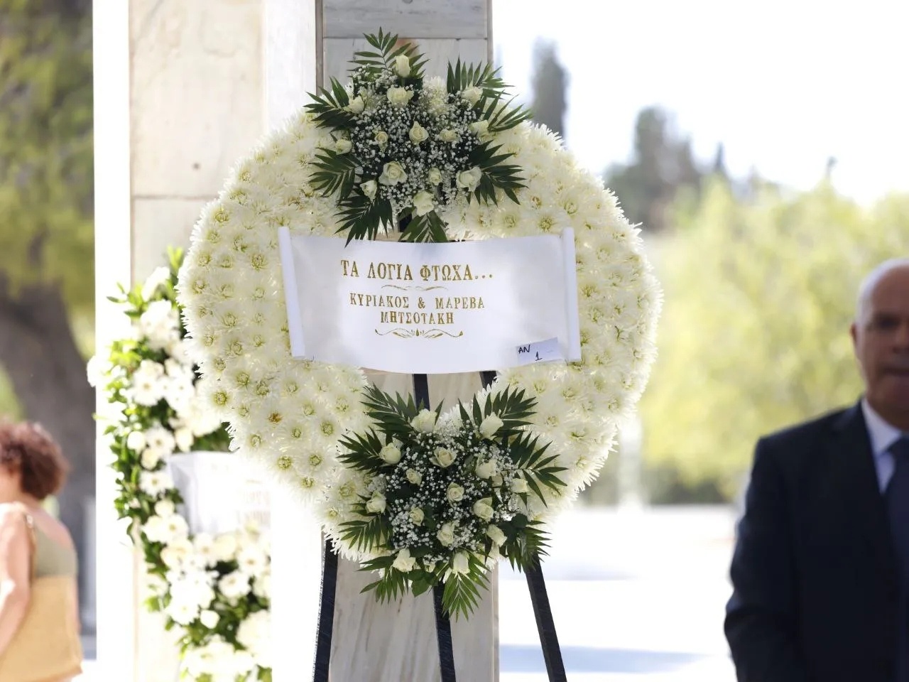 Ανάμεσα στα υπόλοιπα, ξεχωρίζει το στεφάνι του πρωθυπουργού. Ο Κυριάκος Μητσοτάκης μαζί με τη σύζυγό του Μαρέβα, συμμετέχουν στον πόνο της οικογένειας του Αντώνη Σαμαρά με μια απλή φράση: Τα λόγια είναι φτωχά…