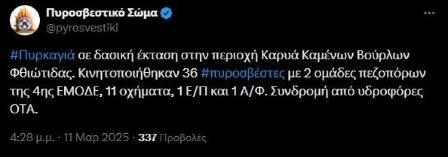 Φωτιά ξέσπασε το απόγευμα της Τρίτης 11 Μαρτίου στα Καμένα Βούρλα και συγκεκριμένα σε δασική έκταση στην περιοχή Καρυά Φθιώτιδας.