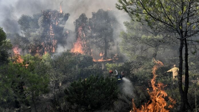 Η πυρκαγιά εκδηλώθηκε σε δασική έκταση και δεν απειλεί σπίτια, σύμφωνα με την Πυροσβεστική.