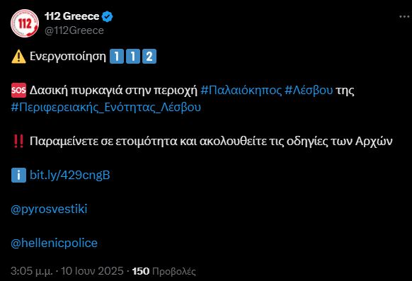 «Δασική πυρκαγιά στην περιοχή Παλαιόκηπος Λέσβου της Περιφερειακής Ενότητας Λέσβου. Παραμείνετε σε ετοιμότητα και ακολουθείτε τις οδηγίες των Αρχών», αναφέρεται στο μήνυμα του 112.