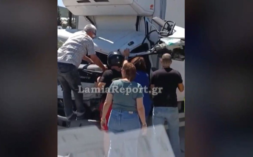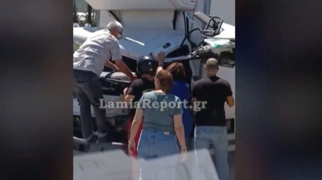 Ο οδηγός του ενός φορτηγού–ψυγείου εγκλωβίστηκε στην καμπίνα του οχήματος με διερχόμενους οδηγούς και αστυνομικούς να σπεύδουν για τον απεγκλωβισμό του.