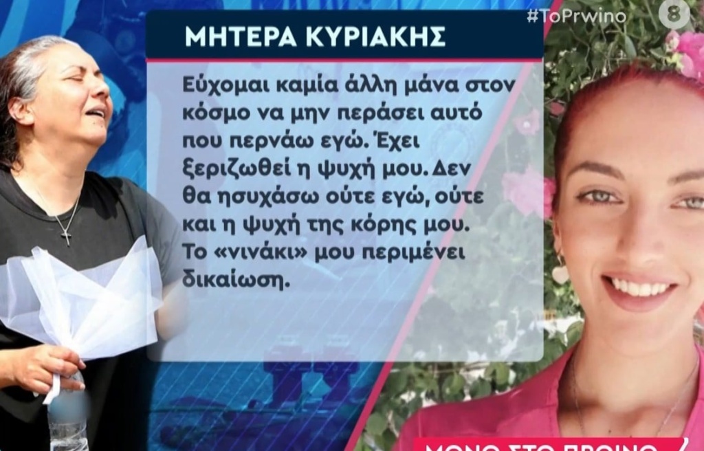 «Θέλω να αποδοθεί δικαιοσύνη, να αναπαυθεί η ψυχή του παιδιού. Ζητάω ένα κεράκι στη μνήμη της Κυριακής μου, έχει ξεριζωθεί η ψυχή μου, το νινάκι μου μου περιμένει δικαίωση», είπε στον ΑΝΤ1 για την κόρη της που έπεσε θύμα του 39χρονου πρώην συντρόφου της έξω από το αστυνομικό τμήμα Αγίων Αναργύρων.