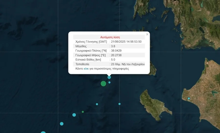 Ο δεύτερος σεισμός στην Κεφαλονιά καταγράφηκε αρχικά στα 3,8 Ρίχτερ νοτιοδυτικά του Ληξουρίου και μετά την επικαιροποίηση στα 3,9 Ρίχτερ.