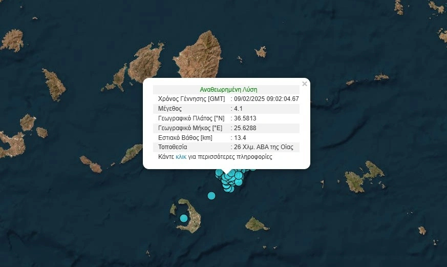 Συγκεκριμένα, πρόκειται για σεισμική δόνηση μεγέθους 4,1 βαθμών της κλίμακας Ρίχτερ, με εστιακό βάθος 13,4 χλμ και 26 χλμ ΑΒΑ της Οίας.