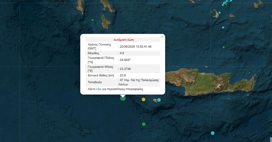 Ο σεισμός είχε εστιακό βάθος 20,6 χλμ. και εκδηλώθηκε 47 χλμ. νοτιοδυτικά της Παλαιοχώρας Χανίων.