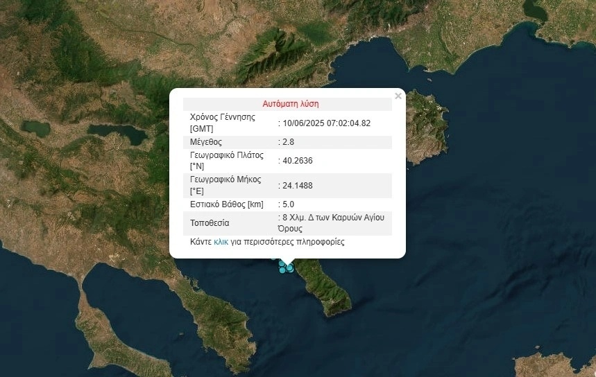 Ο σεισμός σημειώθηκε στις 10:02 το πρωί, 8 χλμ Δυτικά των Καρυών Αγίου Όρους και εστιακό βάθος 5 χλμ.
