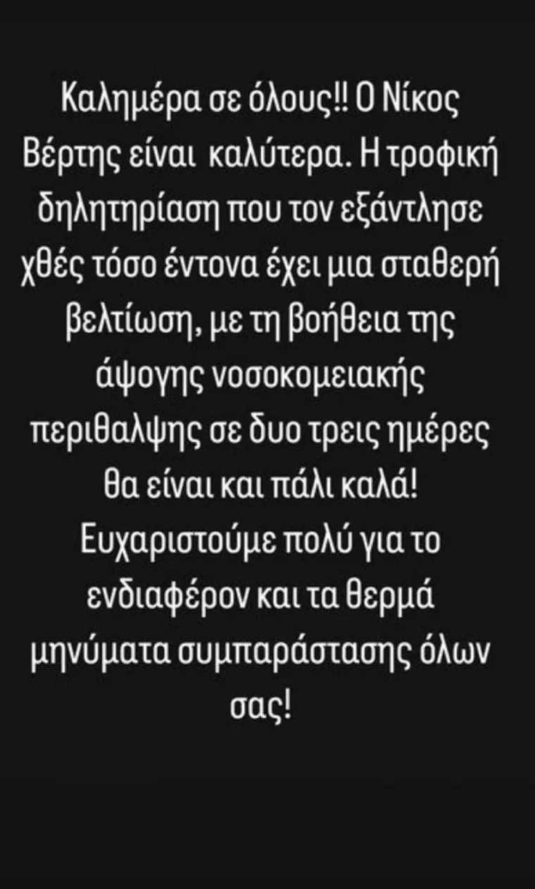 «Ο Νίκος Βέρτης είναι καλύτερα. Η τροφική δηλητηρίαση που τον εξάντλησε χθες τόσο έντονα, έχει μια σταθερή βελτίωση. Με τη βοήθεια της άψογης νοσοκομειακής περίθαλψης σε δύο τρεις μέρες θα είναι και πάλι καλά. Ευχαριστούμε πολύ για το ενδιαφέρον και τα θερμά μηνύματα συμπαράστασης όλων σας».