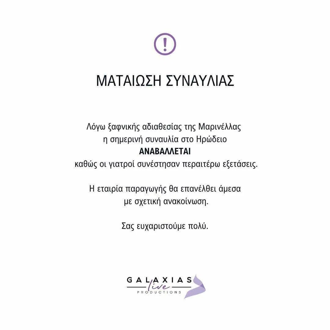 «Λόγω ξαφνικής αδιαθεσίας της Μαρινέλλας η σημερινή συναυλία στο Ηρώδειο αναβάλλεται, καθώς οι γιατροί συνέστησαν περαιτέρω εξετάσεις. Η εταιρεία παραγωγής θα επανέλθει άμεσα με σχετική ανακοίνωση» αναφέρεται χαρακτηριστικά.