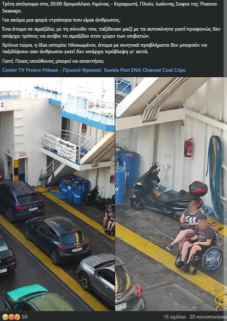 Σε ανάρτησή της στο Facebook γυναίκα που συνταξίδευε με το παιδί με κινητικά προβλήματα, εξέφρασε την αγανάκτησή της για το περιστατικό, αναφέροντας χαρακτηριστικά ότι «για ακόμη μια φορά ντράπηκα που είμαι άνθρωπος. Ένα άτομο σε αμαξίδιο, με τη συνοδό του, ταξίδευαν μαζί με τα αυτοκίνητα γιατί προφανώς δεν υπάρχει τρόπος να ανέβει το αμαξίδιο στον χώρο των επιβατών. Χρόνια τώρα, η ίδια ιστορία: Ηλικιωμένοι, άτομα με κινητικά προβλήματα δεν μπορούν να ταξιδέψουν σαν άνθρωποι γιατί δεν υπάρχει πρόβλεψη γι’ αυτά. Γιατί; Ποιος υπεύθυνος μπορεί να απαντήσει;».