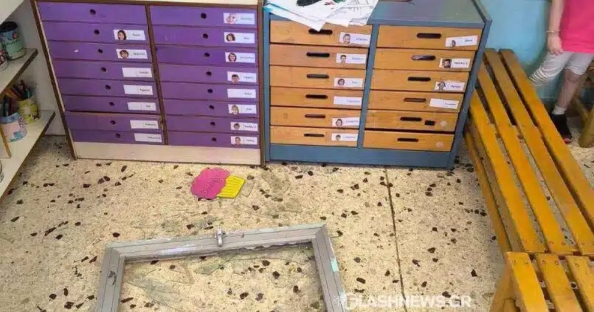 Από καθαρή τύχη δεν σημειώθηκε τραυματισμός μαθητή ή εκπαιδευτικού, καθώς, όπως διακρίνεται και από τη φωτογραφία, το τζάμι προσγειώθηκε δίπλα ακριβώς από ένα παγκάκι μέσα στην αίθουσα, ενώ μαθητές του νηπιαγωγείου φαίνεται πως βρίσκονταν σε απόσταση αναπνοής.