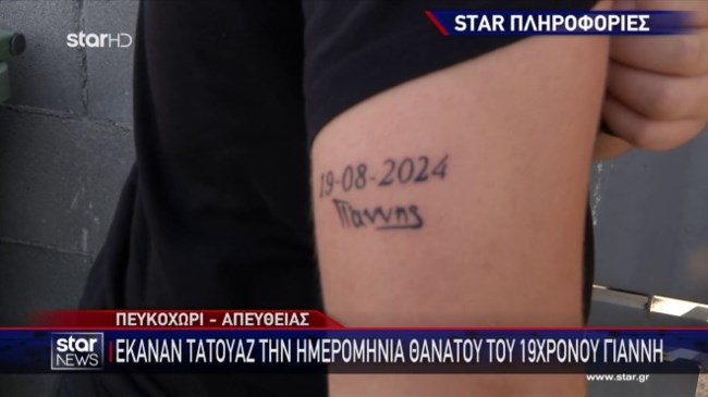 Το τατουάζ στα μπράτσα των αγοριών συγκλονιστικό στιγμιότυπο: “19/8/2024 Γιάννης”. 20 αγόρια, τα αδέρφια και οι φίλοι του 19χρονου χάραξαν στην ψυχή και το μπράτσο τους, ως φόρο τιμής στα νιάτα που χάθηκαν, την ημερομηνία που το αγόρι “έσβησε”.