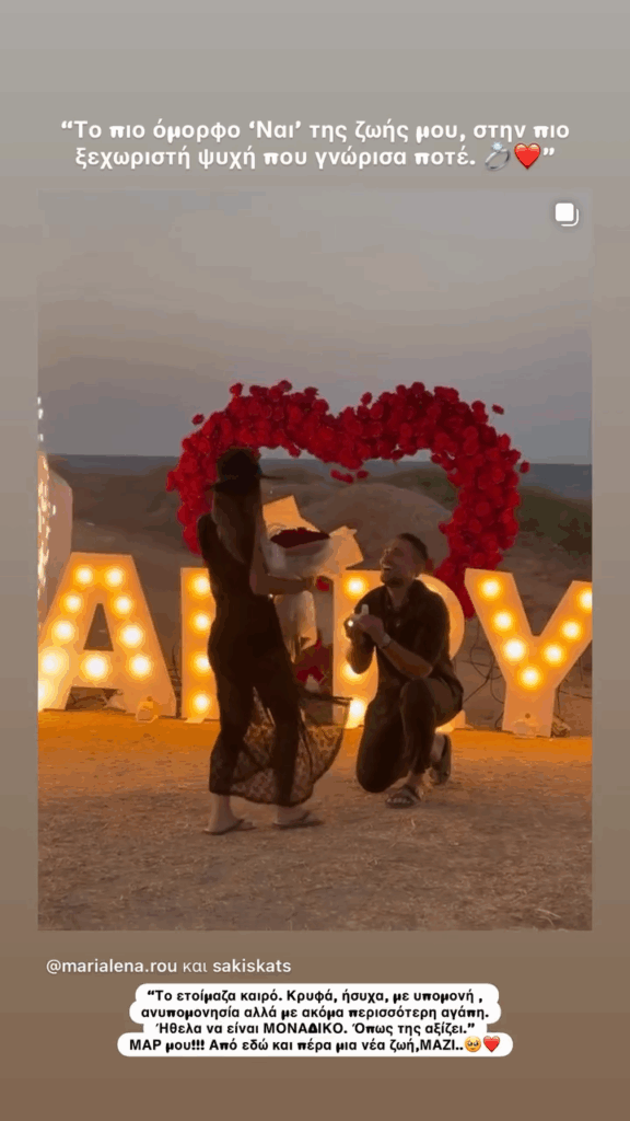 Την ευχάριστη είδηση γνωστοποίησε η μέλλουσα νύφη, μέσα από μία όμορφη ανάρτηση στο προφίλ της στο Instagram, το βράδυ της Κυριακής (27/7) με την πρόταση γάμου από τον Σάκη Κατσούλη.