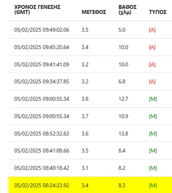 Όπως φαίνεται στην φωτογραφία, από τις 10:24 έως τις 11:49 το πρωί της Τετάρτης, έγιναν 10 σεισμοί άνω των 3,1 έως 3,8 Ρίχτερ.
