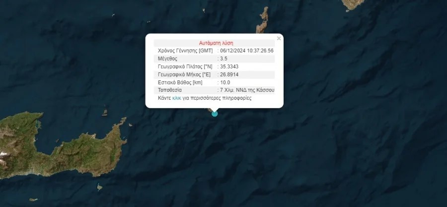 Σεισμική δόνηση μεγέθους 3,5 της κλίμακας Ρίχτερ σημειώθηκε στις 12:37, μόλις 7 χιλιόμετρα Νότια νοτιοδυτικά της Κάσσου.