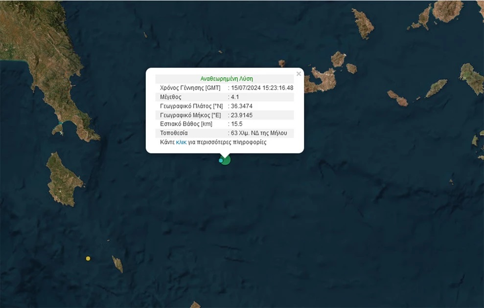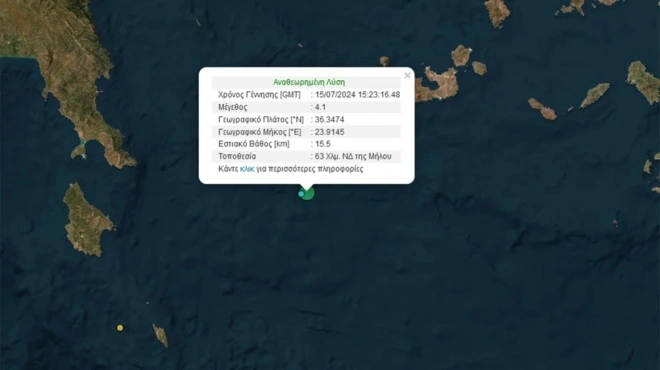 Πιο αναλυτικά και σύμφωνα πάντα με το Γεωδυναμικό Ινστιτούτο, ο σεισμός ήταν μεγέθους 4,1 βαθμών της κλίμακας Ρίχτερ, είχε εστιακό βάθος 15,5 χιλιόμετρα, και το επίκεντρό του εντοπίζεται 63 χιλιόμετρα νοτιοδυτικά της Μήλου.