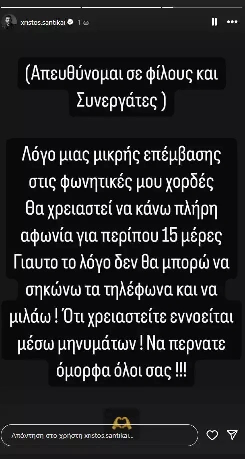 «Λόγω μιας μικρής επέμβασης στις φωνητικές μου χορδές θα χρειαστεί να κάνω πλήρη αφωνία για περίπου 15 μέρες Γι’ αυτό το λόγο δε θα μπορώ να σηκώνω τα τηλέφωνα και να μιλάω! Ότι χρειαστείτε εννοείται μέσω μηνυμάτων! Να περνάτε όμορφα όλοι σας», έγραψε ο Χρήστος Σαντικάι.