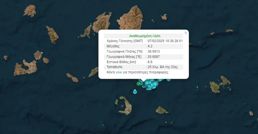 Η σεισμική δόνηση είχε μέγεθος 4,2 της κλίμακας Ρίχτερ με εστιακό βάθος 8,6 χιλιόμετρα, ενώ το επίκεντρο εντοπίζεται 25 χιλιόμετρα Βορειοανατολικά της Οίας.
