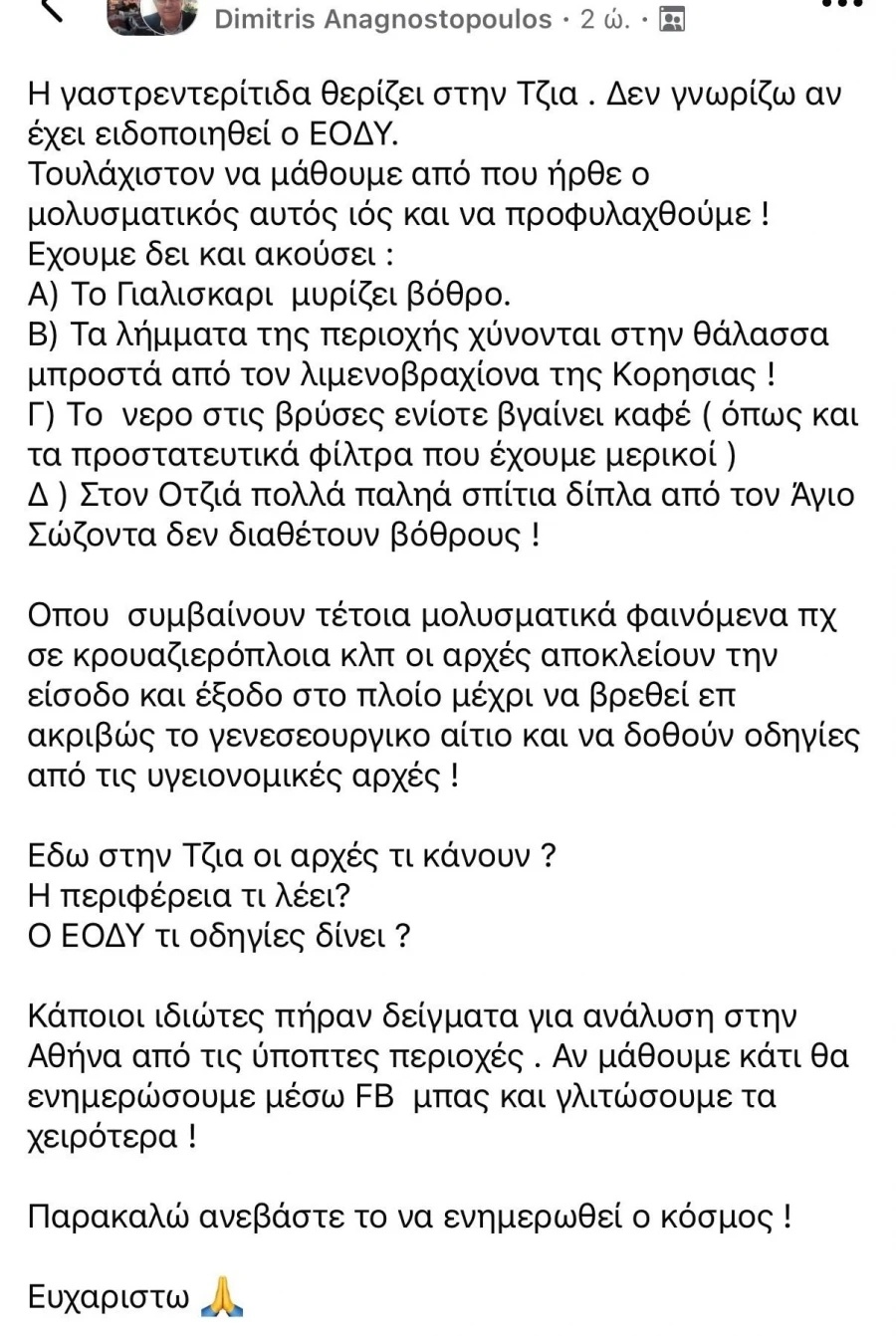 Ολοένα και αυξάνονται τα κρούσματα γαστρεντερίτιδας στην Τζια και οι τοπικοί γιατροί έχουν ενημερώσει σχετικά την αρμόδια Υγειονομική Περιφέρεια, αλλά και τον ΕΟΔΥ.