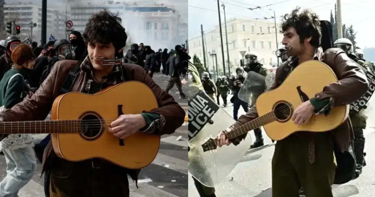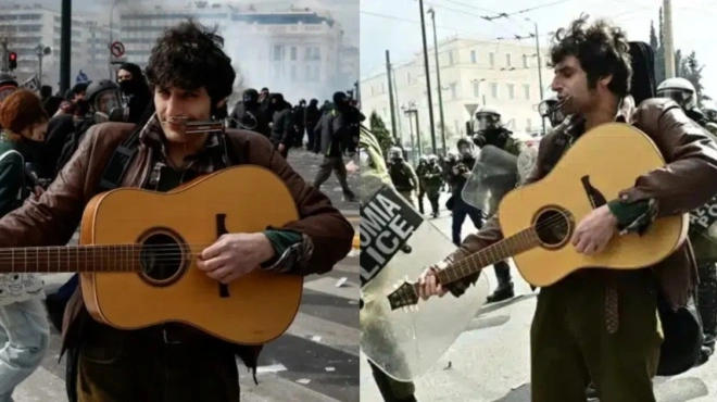 Και κάπου εκεί ανάμεσα, ένας μουσικός, ο οποίος συνέχιζε να παίζει με την κιθάρα του, ενώ πίσω του ο κόσμος έτρεχε για να προστατευτεί από τα επεισόδια.